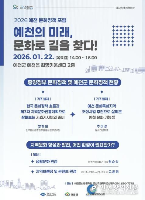 첫 일정인 22일 정책 포럼에서는 '중앙정부 문화정책 및 예천군 문화정책 현황'을 주제로 양혜원 본부장(한국문화관광연구원), 추미경 대표(문화다움)가 발제를 맡는다.