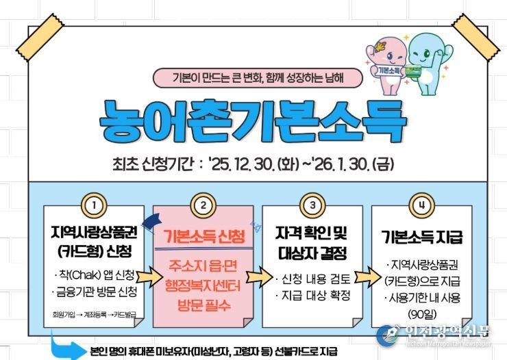 [인천광역신문] 박진 기자 | 남해군은 농어촌 기본소득 신청과 관련해 지역사랑상품권 ‘착(chak)카드’를 발급했더라도 기본소득 신청은 반드시 주소지 관할 읍·면 행정복지센터를 직접 방문해 접수해야 한다고 밝혔다.