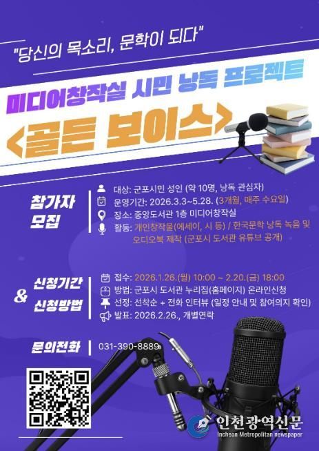 [인천광역신문] 박진 기자 | 군포시 중앙도서관은 시민이 직접 참여하는 낭독 콘텐츠 제작을 통해 공공 문화콘텐츠를 확산하고, 시민의 창작 경험을 지원하기 위해 미디어창작실 시민 낭독 프로젝트 '골든 보이스'를 운영한다.