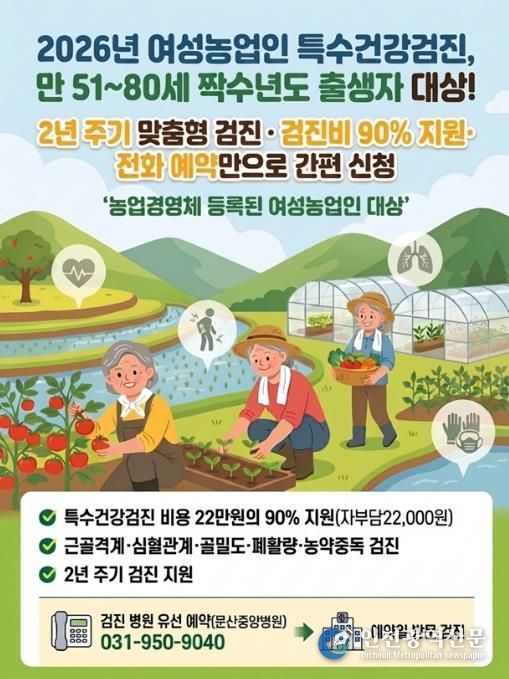 [인천광역신문] 박진 기자 | 파주시는 여성농업인의 건강 보호와 복지 증진을 위해 ‘여성농업인 특수건강검진 지원사업’과 ‘여성농업인 행복바우처 지원사업’을 함께 추진하며 여성농업인을 위한 맞춤형 지원을 강화하고 있다.