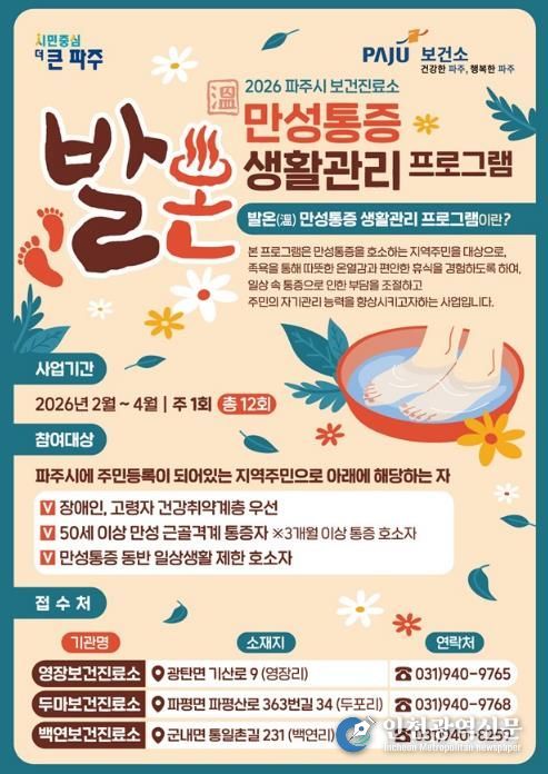 [인천광역신문] 박진 기자 | 파주시 보건진료소는 보건의료 취약지역 주민들의 건강증진을 위해 2026년 ‘발온(溫) 만성통증 생활관리’교실을 운영한다.