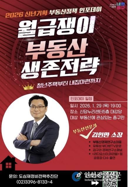 [인천광역신문] 박진 기자 | 서울 중구가 급변하는 부동산 환경 속에서 주민들의 현실적인 대응 전략을 돕기 위해 오는 29일 저녁 7시 신당누리센터 5층 대강당에서 올해 첫 도시런(learn) 스쿨‘신년기획 부동산 전략 인포(INFO)데이’를 연다.