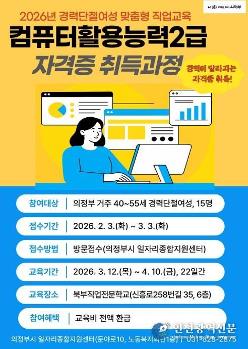 [인천광역신문] 박진 기자 | 의정부시는 경력단절여성의 취업역량 강화를 위해 2월 3일부터 3월 3일까지 ‘컴퓨터활용능력2급 자격증 취득과정’ 참여자를 모집한다.