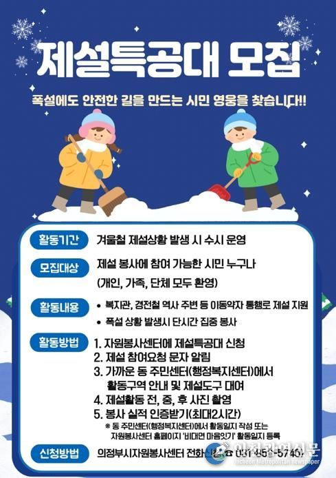[인천광역신문] 박진 기자 | 의정부시는 겨울철 폭설로 인한 시민 불편을 최소화하고 안전한 보행환경을 조성하기 위해 ‘제설특공대’를 모집한다.
