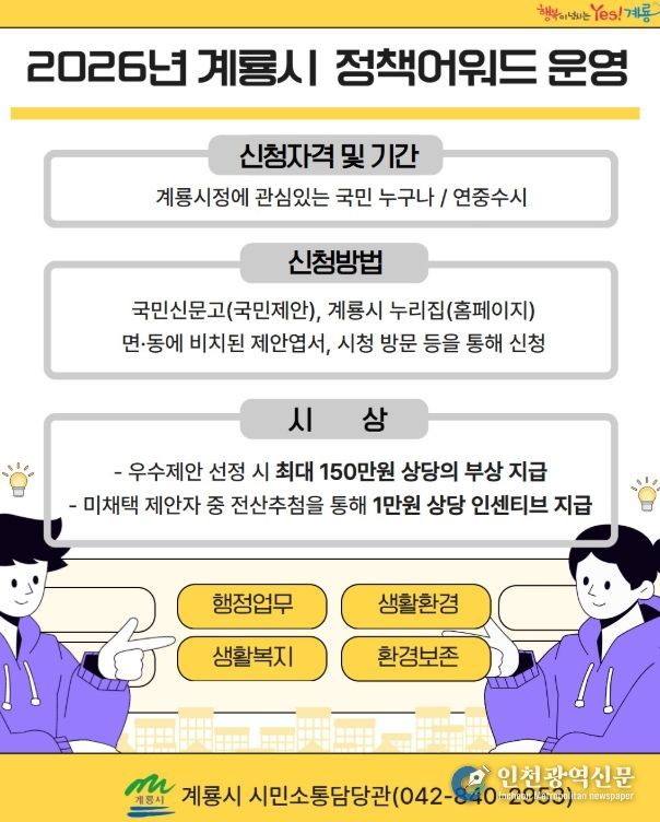 [인천광역신문] 박진 기자 | 충남 계룡시는 시민의 다양하고 창의적인 아이디어를 시정에 적극 반영하기 위해 ‘2026년 계룡시 정책 어워드(AWARD)’를 연중 운영한다고 밝혔다.