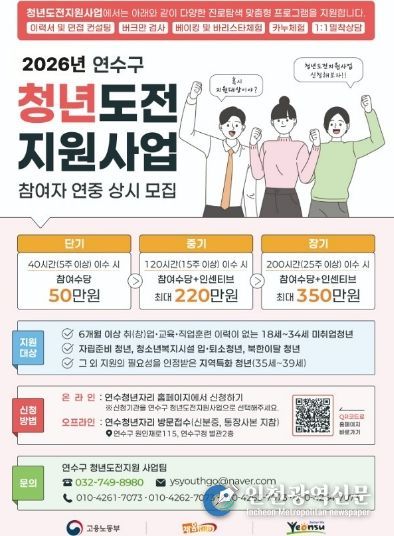 [인천광역신문] 박진 기자 | 연수구는 청년들의 경제 활동과 노동시장 진입을 돕기 위해 ‘2026년 청년도전지원사업’ 참여자를 모집한다.