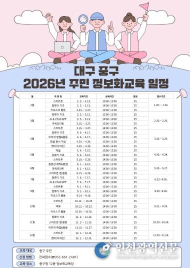 류규하 중구청장은 “디지털 환경 변화에 따라 행정과 일상에서 요구되는 정보 활용 능력도 점점 높아지고 있다”며 “기초 교육부터 최신 기술까지 아우르는 주민 정보화교육을 통해 구민 누구나 디지털 환경에 능동적으로 대응할 수 있도록 지원하겠다”고 말했다.