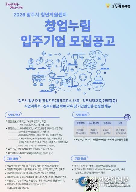 [인천광역신문] 박진 기자 | 광주시는 지역 내 유망한 청년 창업가를 발굴하고 안정적인 창업 환경을 조성하기 위해 ‘2026년도 창업누림 신규 입주기업’을 공개 모집한다고 19일 밝혔다.