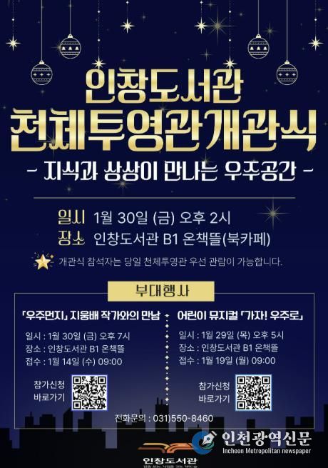 [인천광역신문] 박진 기자 | 구리시는 오는 1월 30일 오후 2시 인창도서관 지하 북카페에서 주요 내빈이 참석한 가운데 4층 야외에 조성된 인창도서관 천체투영관 개관식을 개최한다고 밝혔다.
