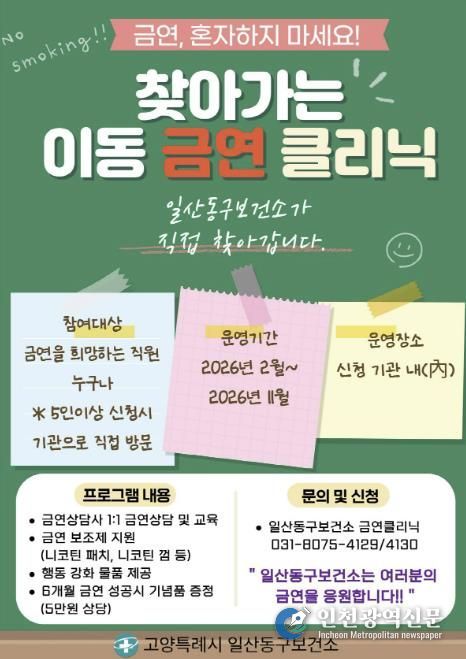 [인천광역신문] 박진 기자 | 고양특례시 일산동구보건소는 보건소 방문이 어려운 직장인 흡연자를 대상으로 ‘찾아가는 금연클리닉’을 운영한다고 19일 밝혔다.