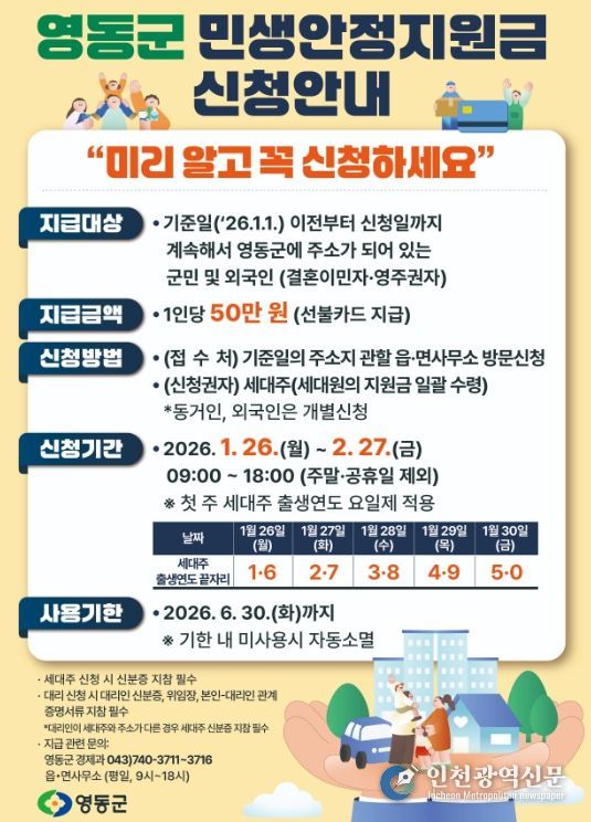 [인천광역신문] 박진 기자 | 충북 영동군은 고물가로 어려움을 겪는 군민들의 가계 부담을 덜어주고 지역 내 소비 선순환을 통한 민생 경제회복을 위해 오는 26일부터 영동군민에게 1인당 50만 원의 민생안정지원금을 지급한다.
