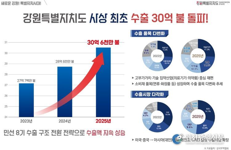 [인천광역신문] 박진 기자 | 강원특별자치도는 민선 8기 출범 이후 미국의 관세 부과와 신보호무역주의 확산, 국제 분쟁 장기화 등 어려운 통상 여건 속에서도 사상 처음으로 연간 수출 30억 불(한화 4조 5천억 원)을 달성했다고 밝혔다.