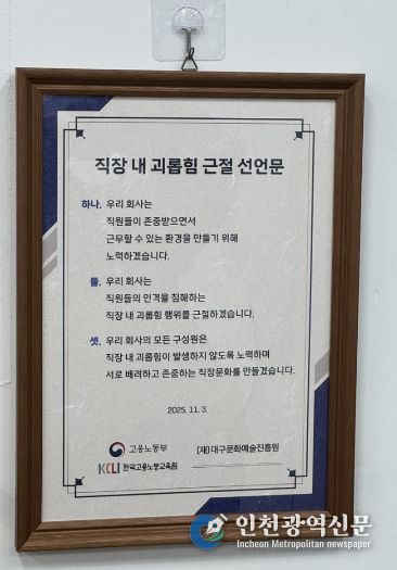 [인천광역신문] 박진 기자 | 대구문화예술진흥원이 고용노동부 산하 한국고용노동교육원이 주관한 ‘2025 찾아가는 직장 내 괴롭힘 예방교육 사업장 강사지원 교육 프로그램 수료 사업장’을 인증받았다.