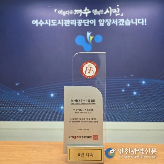 [인천광역신문] 박진 기자 | 여수시도시관리공단(이사장 송병구)은 한국경영인증원(KMR)으로부터 ‘노사관계 우수기업’ 인증을 4년 연속 획득했다고 19일 밝혔다.