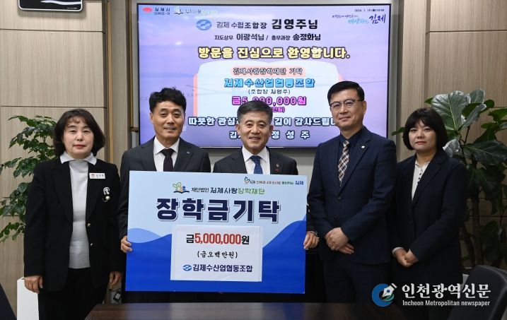 [인천광역신문] 박진 기자 | 김제사랑장학재단은 19일 김제수산업협동조합(조합장 김영주)과 새만금장례식장(대표 김덕운)이 지역 인재 육성을 위한 장학금으로 각각 500만 원과 300만 원을 기탁했다고 밝혔다.