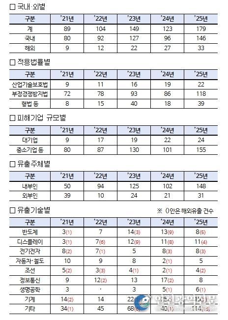 유출 기술별로는 ▵기계(15건, 8.3%) ▵디스플레이(11건, 6.1%) ▵반도체(8건, 4.5%) ▵정보통신(8건, 4.5%) ▵이차전지(8건, 4.5%) ▵생명공학(6건, 3.4%) ▵자동차·철도(5건, 2.8%) 등 순으로 나타났다.