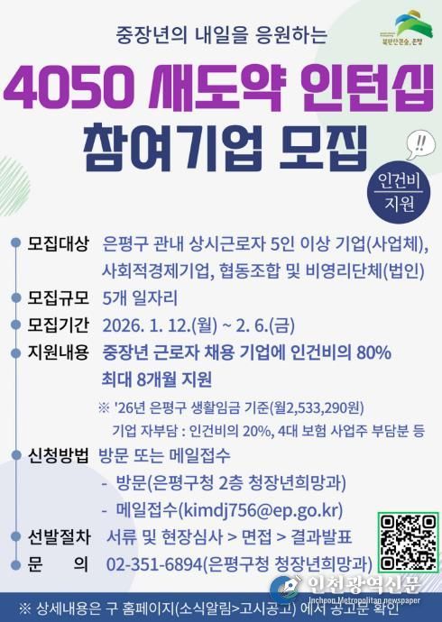 [인천광역신문] 박진 기자 | 서울 은평구는 직업 전환이 필요한 중장년 세대에게 양질의 일자리를 제공하기 위해 ‘4050 새도약 인턴십 프로그램’에 참여할 기업을 모집한다고 밝혔다.