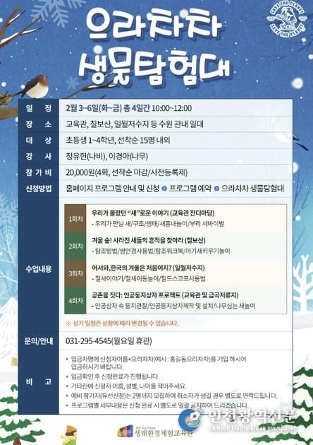 [인천광역신문] 박진 기자 | 칠보생태환경체험교육관이 겨울방학 프로그램 ‘으라차차 생물탐험대(겨울 탐조프로젝트)’에 참여할 초등학교 1~4학년 어린이 15명을 선착순으로 모집한다.