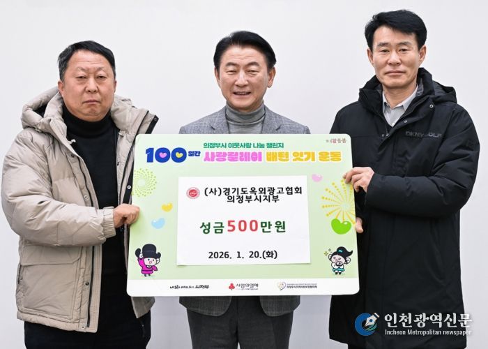 [인천광역신문] 박진 기자 | 의정부시는 1월 20일 (사)경기도옥외광고협회 의정부시지부가 ‘100일간 사랑릴레이 배턴 잇기’에 동참해 성금 500만 원을 기탁했다고 밝혔다.