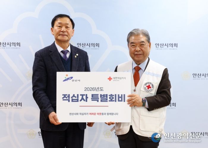 [인천광역신문] 박진 기자 | 안산시의회가 20일 ‘2026년 적십자 특별회비 전달식’을 갖고 대한적십자사 경기도지사에 특별회비를 전달했다.