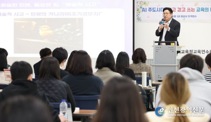 [인천광역신문] 박진 기자 | 도성훈 인천광역시교육감은 20일 인천교육연수원에서 ‘초등 1급 정교사 자격연수’ 대상자 87명에게 ‘AI주도시대, 읽고, 걷고, 쓰는 교육의 미래’라는 주제로 강연을 진행했다.