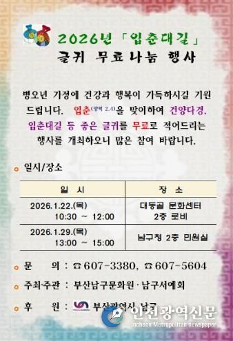 [인천광역신문] 박진 기자 | 부산 남구는 24절기의 첫 번째 절기인 입춘(2월 4일)을 맞아 구민의 안녕과 길운을 기원하는 '입춘방 나눔행사'를 개최한다고 밝혔다.