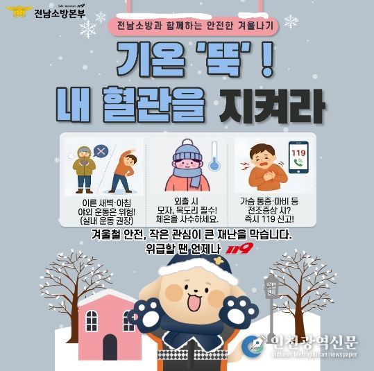 [인천광역신문] 박진 기자 | 전남소방본부(본부장 주영국)는 최근 기온이 급격히 떨어지는 한파가 이어지면서 심근경색, 뇌졸중 등 심뇌혈관 질환 발생 위험이 높아짐에 따라 도민들의 각별한 주의를 당부했다.