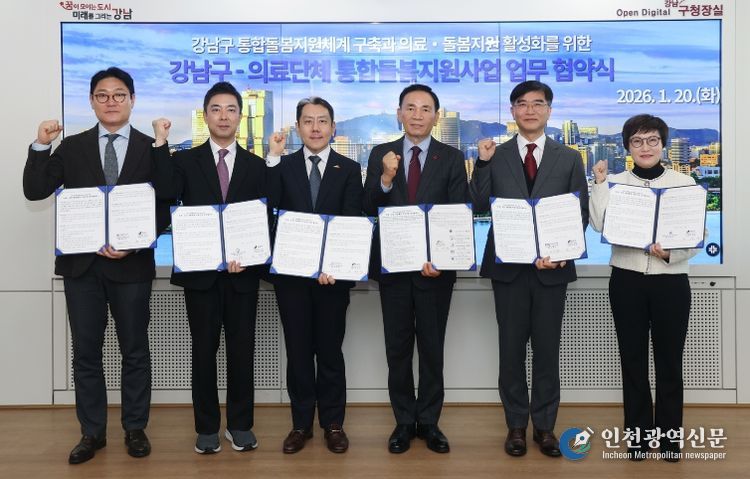 [인천광역신문] 박진 기자 | 꿈이 모이는 도시, 미래를 그리는 강남구가 1월 20일 관내 5대 의료단체(강남구 의사회·치과의사회·한의사회·약사회·간호사회)와 ‘강남구 통합돌봄지원체계 구축을 위한 의료·요양 통합돌봄지원사업 업무협약(MOU)’을 체결했다.