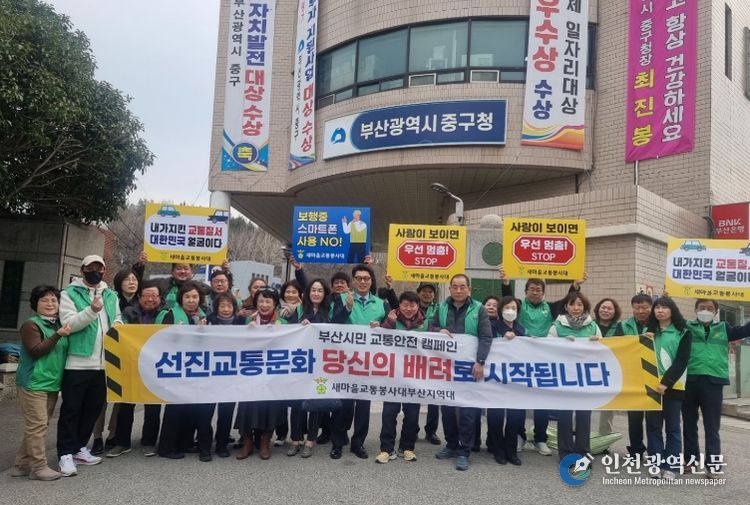 [인천광역신문] 박진 기자 | 부산광역시중구새마을회(회장 이형목)는 지난 19일 중구청 앞에서 ‘부산시민 교통안전 캠페인’을 펼쳤다. 회원들은 현수막과 피켓을 이용해 시민들에게 교통법규 준수의 중요성을 알리고, 안전한 보행환경 조성에 적극 동참해 줄 것을 당부했다.