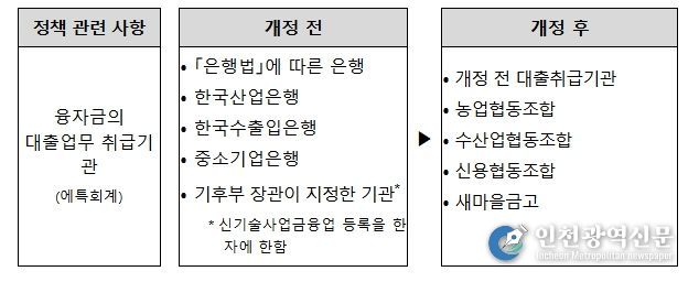 이번 개정안은 재생에너지 정책융자 취급기관(현재 15개 기관)에 지역과 밀접한 4개 금융기관 추가를 주요 내용으로 하고 있다.