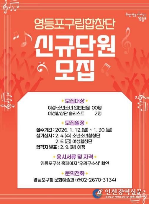 [인천광역신문] 박진 기자 | 영등포구가 지역 문화 예술을 함께 이끌어 갈 영등포구립합창단 신규 단원을 오는 30일까지 공개 모집한다고 밝혔다.