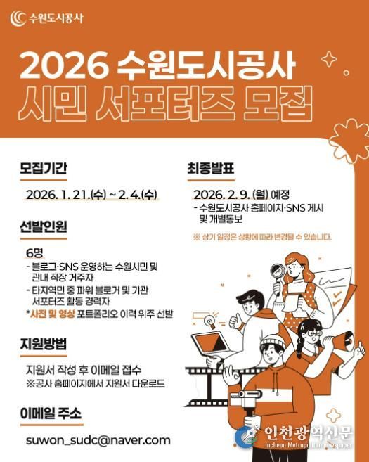[인천광역신문] 박진 기자 | 수원도시공사가 21일부터 다음 달 4일까지 2026년도 제8기 시민 서포터즈를 모집한다.