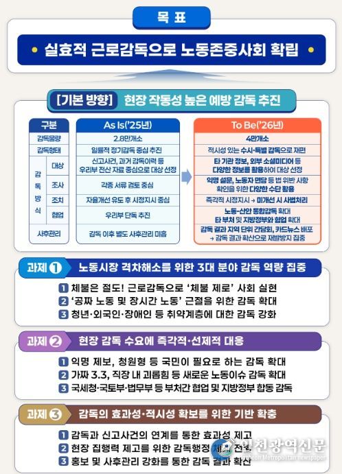 [인천광역신문] 박진 기자 | 고용노동부는 1월 22일, 모든 일하는 사람의 노동조건을 두텁게 보호하고, 위험의 격차가 없는 공정하고 안전한 일터를 위한 「2026년 사업장 감독계획」을 발표했다.