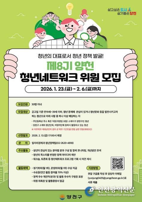 [인천광역신문] 박진 기자 | 양천구는 청년이 직접 정책을 발굴하고 실행방안을 제안하는 청년 중심 소통 플랫폼 ‘제8기 양천 청년네트워크’ 위원을 2월 6일까지 모집한다고 밝혔다.