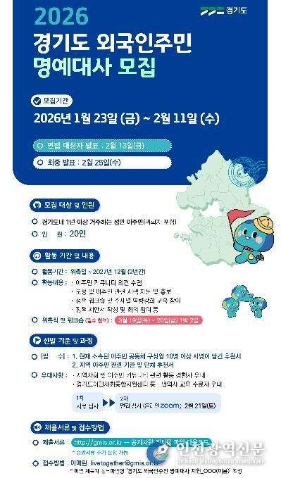[인천광역신문] 박진 기자 | 경기도가 오는 2월 10일까지 ‘경기도 외국인주민 대사’ 20명을 모집한다.