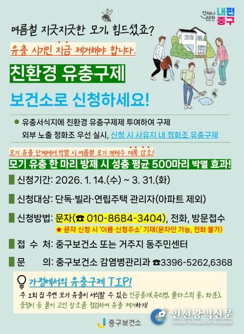 신청 방법은 간단하다. '모기 방역 소통폰'에 이름과 주소를 문자로 전송하면 된다. 중구 감염병관리과 또는 거주지 동 주민센터로 유선이나 방문 접수도 가능하다. 지난해 신청한 장소는 별도 신청하지 않더라도 올해 다시 찾아간다.