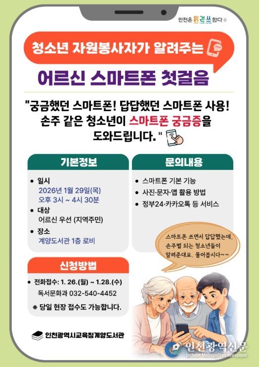 [인천광역신문] 박진 기자 | 인천광역시교육청계양도서관은 오는 29일 1층 로비에서 ‘어르신 스마트폰 첫걸음’행사를 운영한다.