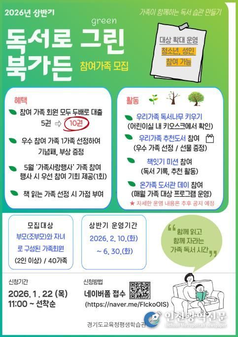 [인천광역신문] 박진 기자 | 경기도교육청평생학습관이 가족과 함께 책을 읽고 소통하는 독서 문화 확산을 위해 녪년 독서로 그린(green) 북가든’을 운영한다.