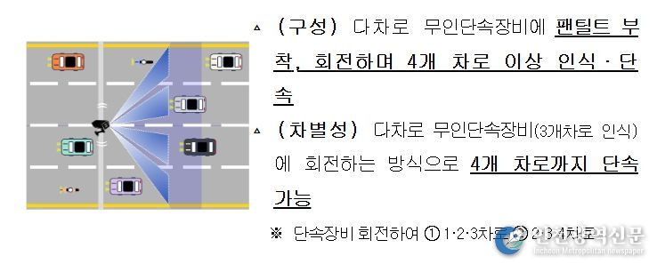 [인천광역신문] 관리자 기자 | 경찰청은 최근 급증하고 있는 무인교통단속장비를 효율적으로 관리하기 위하여 편도 3차로 이상을 단속할 수 있는 ‘다차로·회전식 단속장비’를 도입하는 등 운영 효율화 방안을 추진한다.