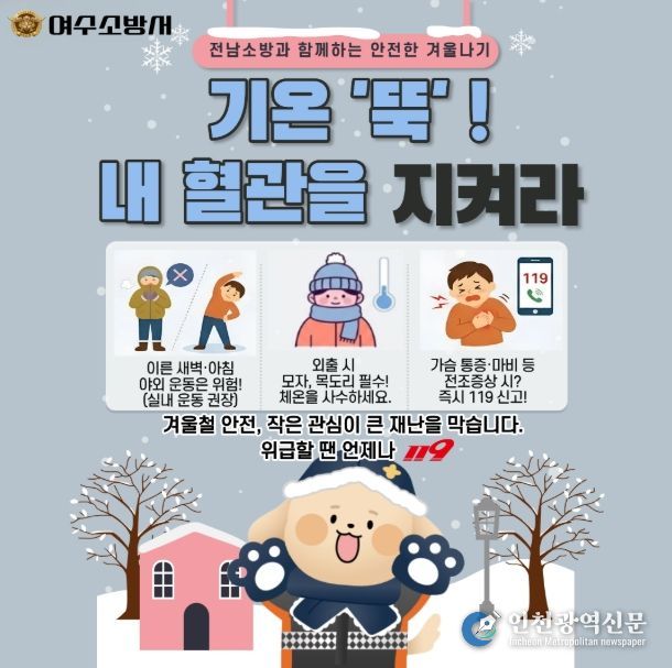 [인천광역신문] 관리자 기자 | 여수소방서(서장 서승호)는 겨울철 한파로 인한 각종 안전사고를 예방하고 시민들의 건강을 보호하기 위해 겨울철 생활안전수칙 집중 홍보에 나섰다고 밝혔다. 이번 캠페인은 기온 급강하로 인해 발생할 수 있는 심뇌혈관 질환, 저체온증 등 건강 피해를 예방하고 안전한 겨울나기를 돕기 위해 마련됐다.