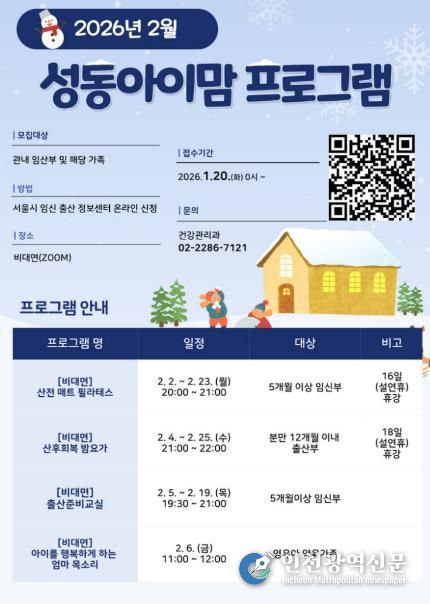 [인천광역신문] 관리자 기자 | 서울 성동구는 임산부들을 대상으로 '성동 아이맘 프로그램'을 운영한다고 밝혔다. 이번 프로그램은 4종류로 편성해 2월 2일부터 2월 25일까지 4주간 비대면(온라인)으로 진행된다.
