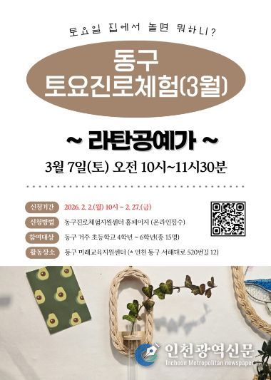 참여를 희망하는 학생은 오는 2월 2일~2월 27일까지 인천 동구진로체험지원센터 홈페이지를 통해 온라인으로 신청할 수 있으며, 참가비는 전액 무료다. 자세한 사항은 동구진로체험지원센터로 문의하면 된다.