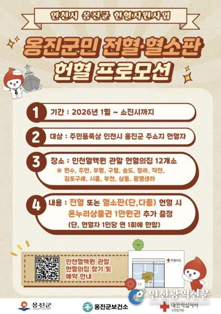 지원대상은 주민등록상 주소지가 옹진군인 군민으로, 인천혈액원 관할 12개소의 헌혈의 집에서 전혈 또는 혈소판(단·다종) 헌혈을 하며, 헌혈 현장에서 온누리상품권 1만원을 직접 지급 받을 수 있다. 다만 지원은 헌혈자 1인당 연 1회에 한정되며, 상품권이 소진될 때까지만 선착순 제공된다.