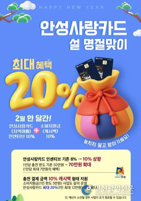 [인천광역신문] 관리자 기자 | 안성시가 설 명절을 맞아 시민들의 장바구니 부담을 덜어주고, 위축된 골목상권에 활력을 불어넣기 위해 2월 한 달간 안성사랑카드 혜택을 최대 20%로 상향한다.
