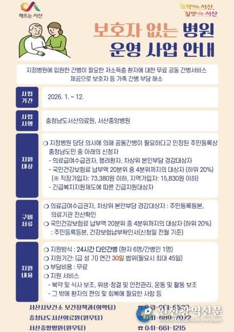 [인천광역신문] 관리자 기자 | 충남 서산시가 저소득층 환자와 보호자의 간병 부담을 해소하기 위해 ‘보호자 없는 병원 사업’을 연중 운영 중이다.