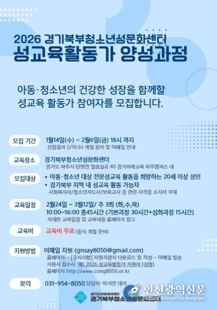 [인천광역신문] 관리자 기자 | 경기북부청소년성문화센터가 오는 2월 6일까지 청소년 성교육 활동가 양성과정에 참여할 지원자를 모집한다.