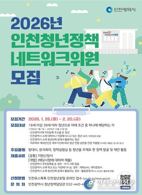 [인천광역신문] 관리자 기자 | 인천광역시는 청년이 정책의 수혜자를 넘어 직접 정책을 기획하고 실험하는 주체로 참여할 수 있도록 '2026년 인천청년정책네트워크' 청년위원을 1월 29일부터 2월 20일까지 공개 모집한다고 밝혔다.