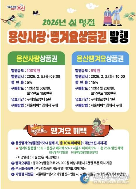 [인천광역신문] 관리자 기자 | 서울 용산구가 2026년 설 명절을 맞아 구민의 소비 부담을 줄이고 지역경제를 활성화하기 위해 총 105억 원 규모의 ‘용산사랑상품권(100억)’과 ‘용산땡겨요상품권(5억)’을 발행한다.