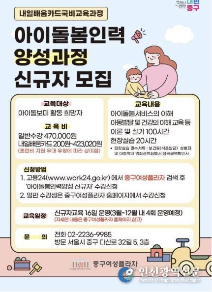 [인천광역신문] 관리자 기자 | 서울 중구가 개별 가정의 돌봄 공백을 해소하고 안정적인 취업 기회를 확대하기 위해 중구여성플라자와 함께 ‘아이돌봄인력 양성과정’을 운영한다.