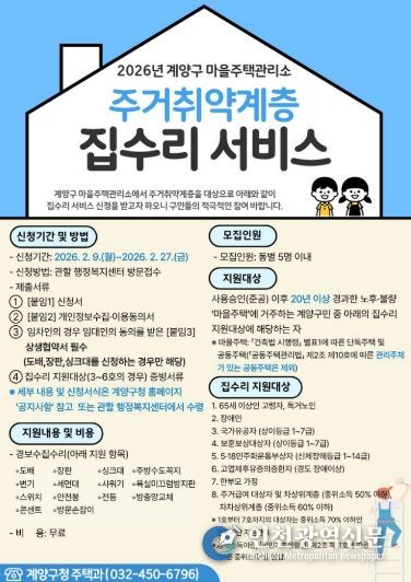 [인천광역신문] 관리자 기자 | 인천광역시 계양구는 작전동에 운영 중인 마을주택관리소에서 주거취약계층을 위한 집수리 서비스를 추진한다고 밝혔다.